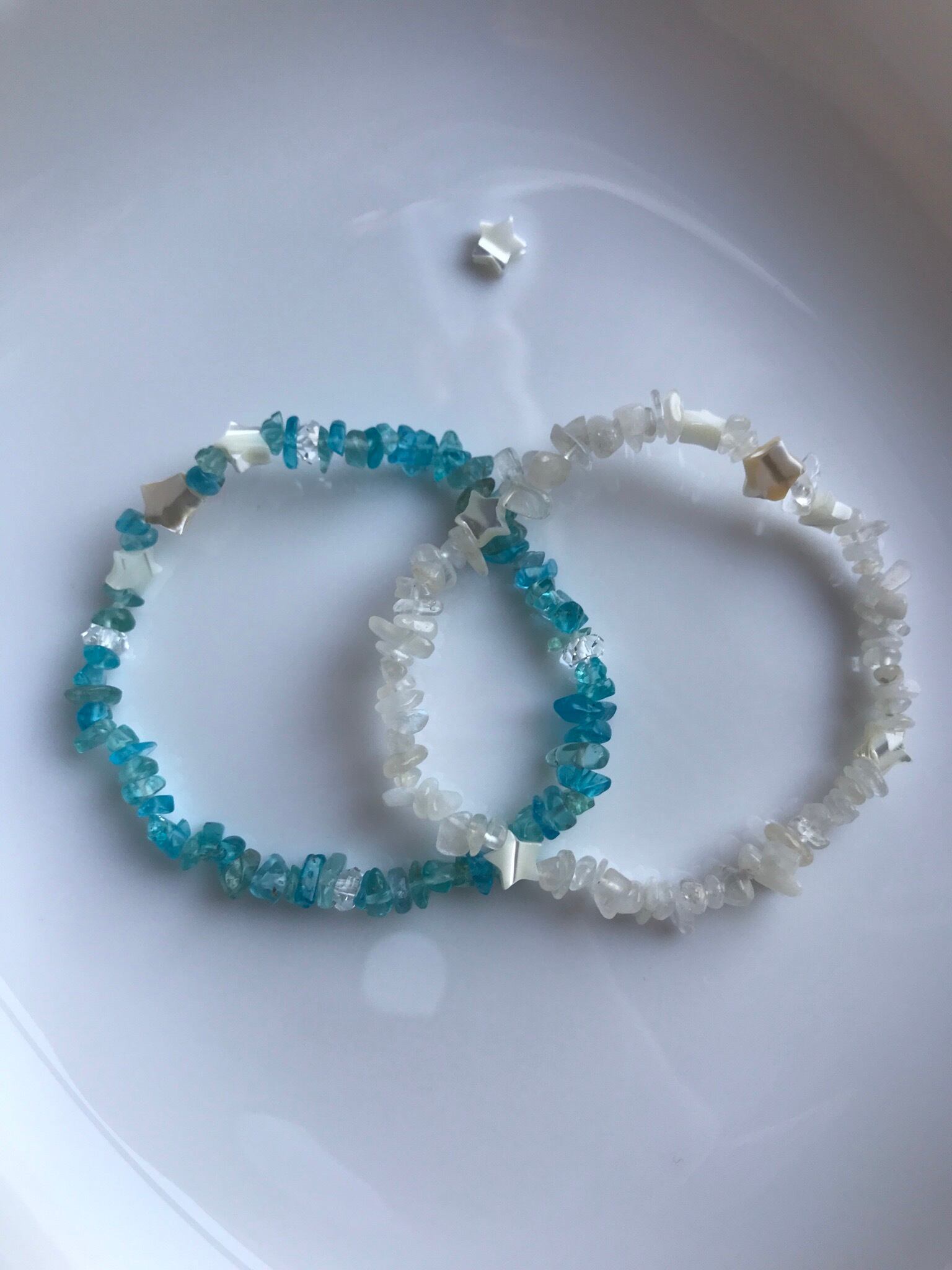 A: ブルーアパタイト(写真2、4、6枚目)手首周り約16.5cm