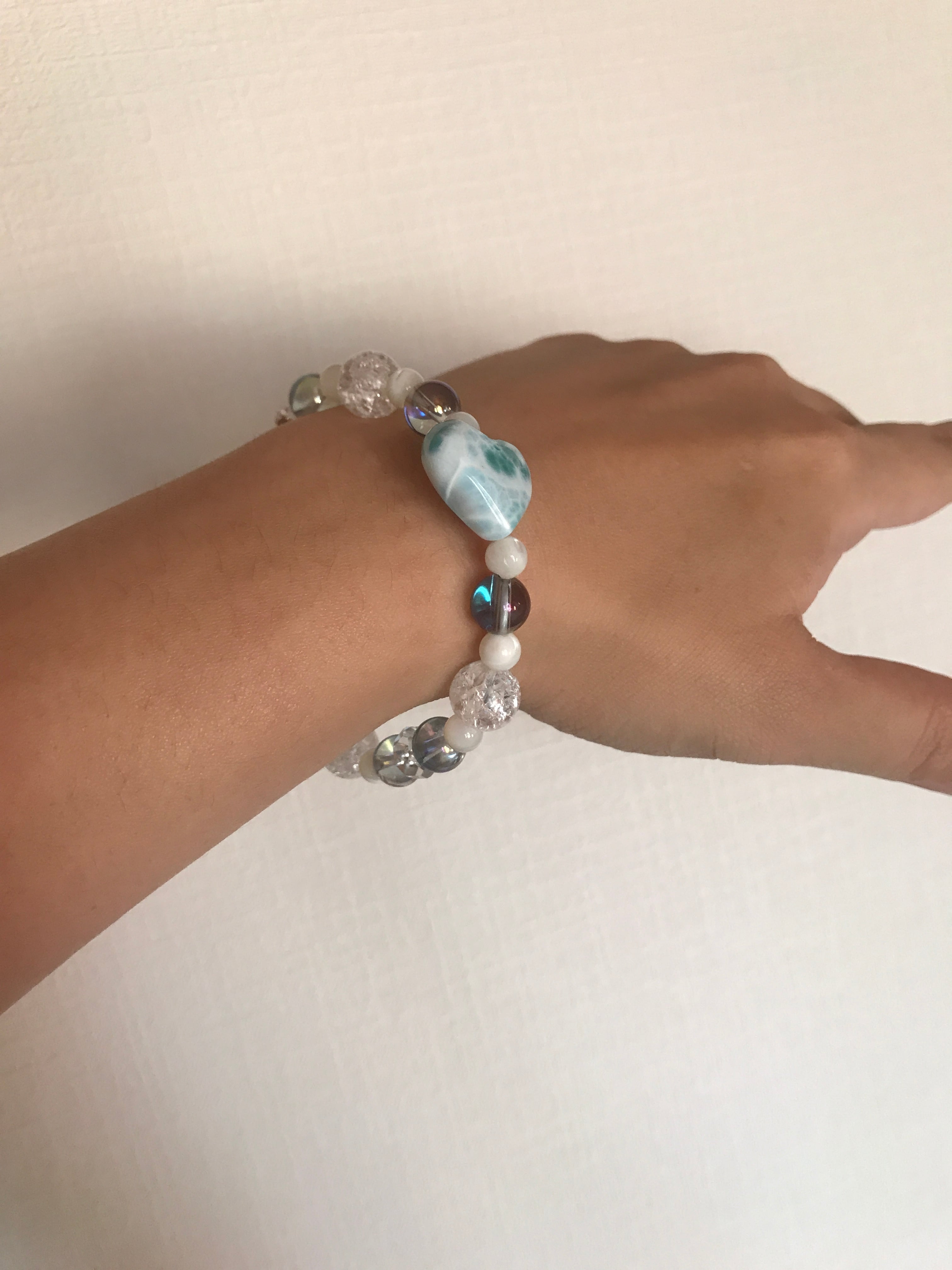 世界三大ヒーリングストーン、ドミニカ共和国産のラリマーのハート型ビーズのデザインブレスレットです。