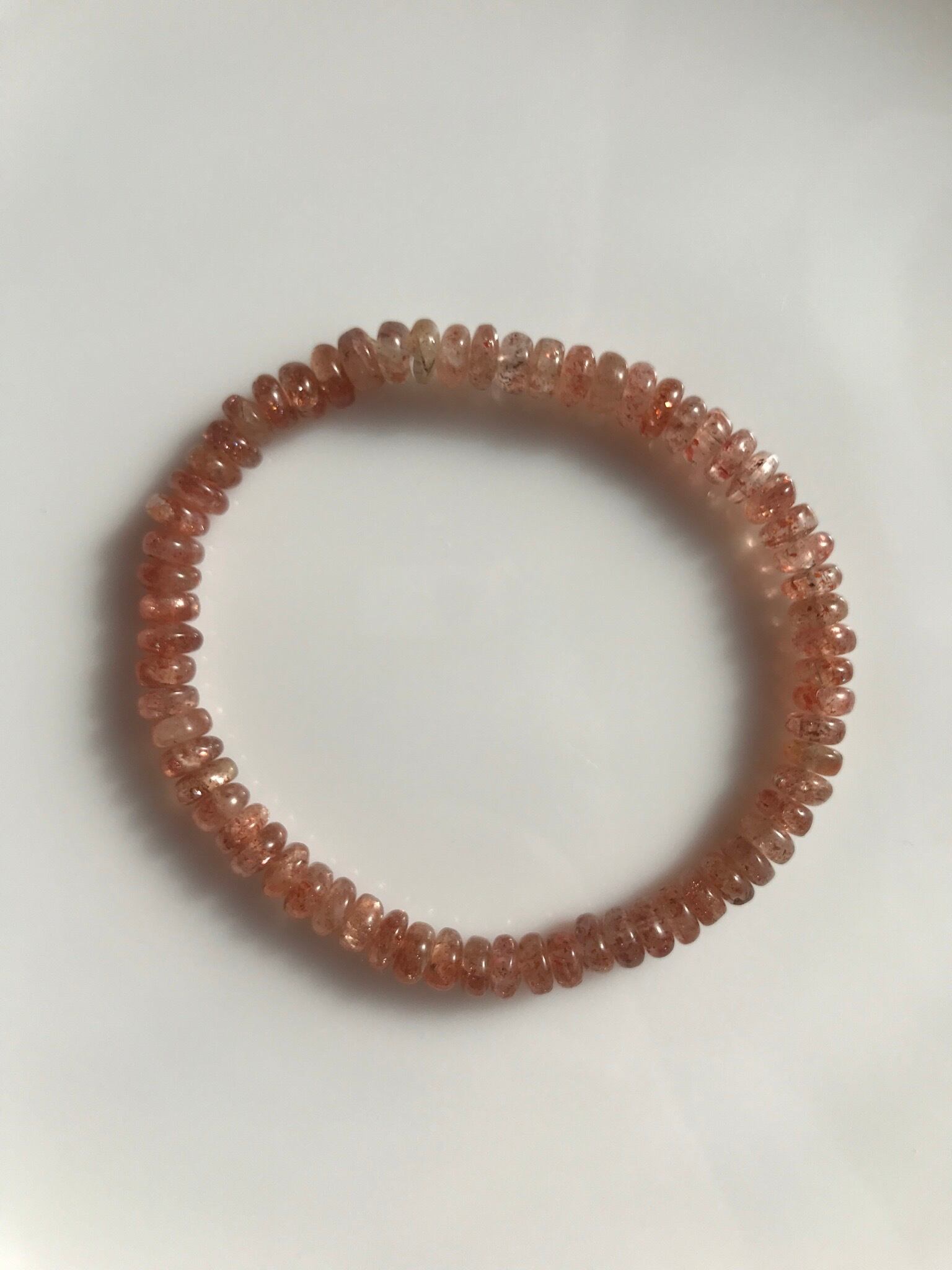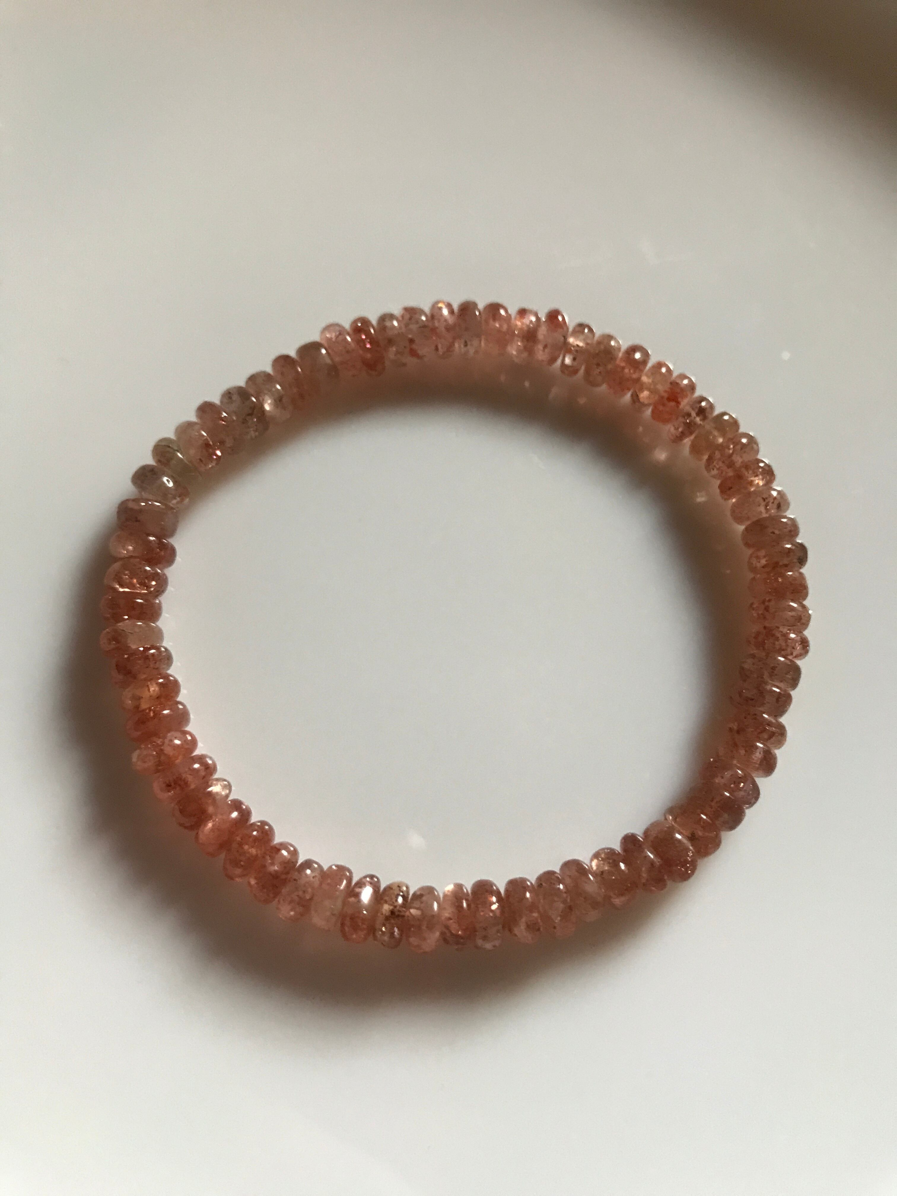 ギラギラのラメの様な輝きがありつつ、渋めの落ち着いたオレンジカラーのタンザニア産サンストーンのボタンロンデルカットブレスレットです。