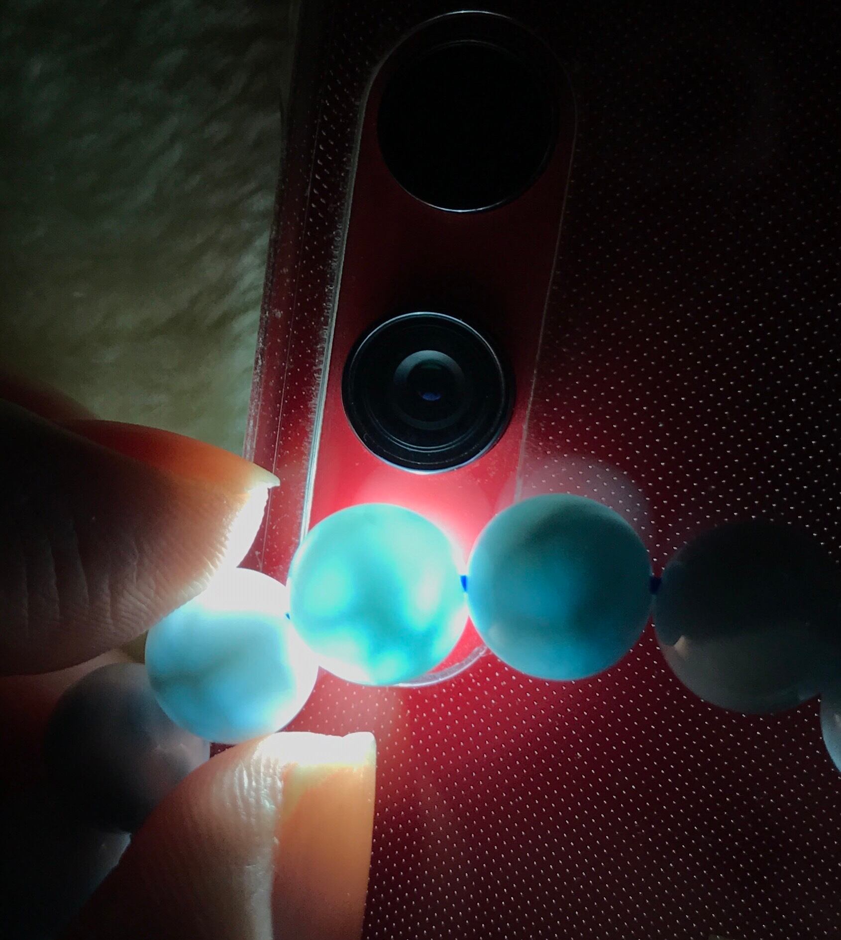 ドミニカ共和国産のラリマーのブレスレットです。光に当てると透過します。