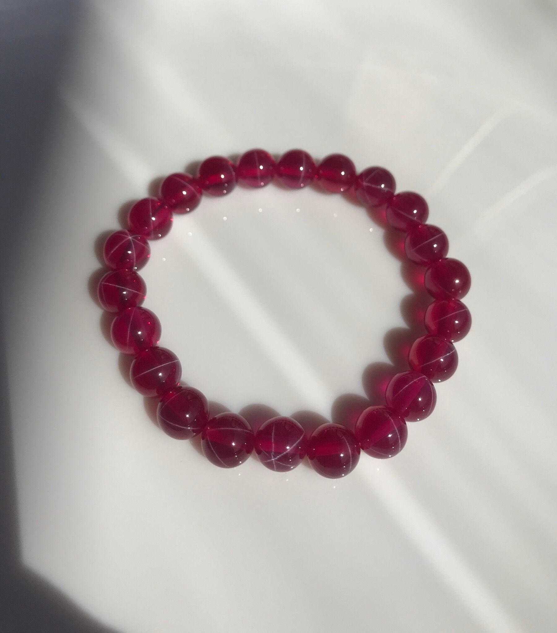 こちらは人工によりルビーの生成過程を再結晶し作り上げた極上のスタールビーです。全粒にシャープな六条スターが出ます。