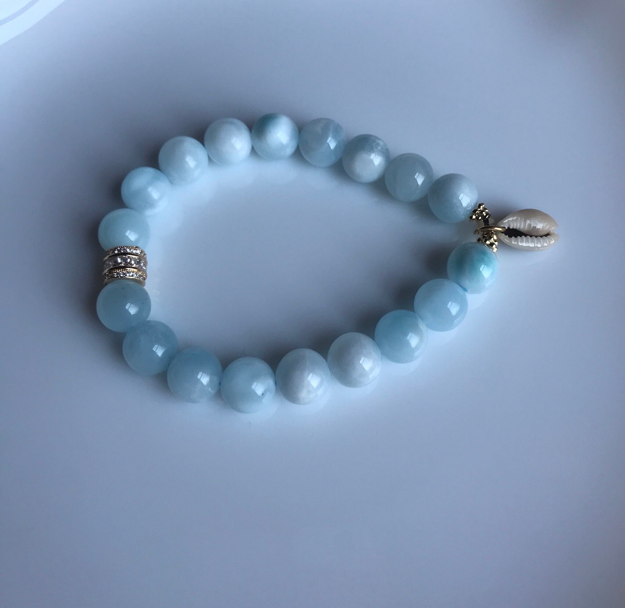 ほんのりベイビーブルーのアイスラリマーにジルコニア仕様のゴールドロンデルをワンポイントにジュエリー感を出し、天然の貝殻をチャームに付けた夏らしい可愛いデザインブレスレットです。