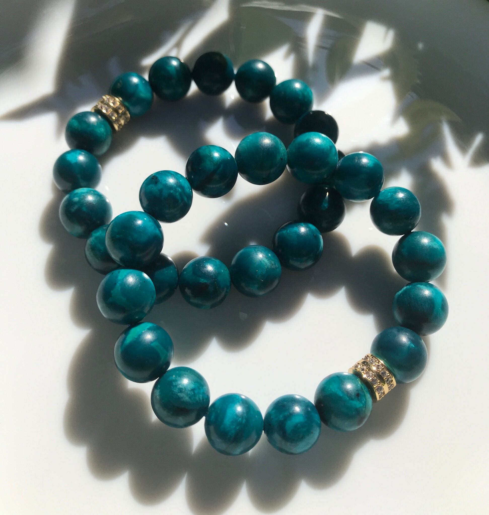 夏の日差しに映えるブルーグリーンカラーの綺麗なブレスレットです。ワンポイントにゴールドカラーのジルコニア仕様のロンデルを使い、さらにブルーグリーンが映えるジュエリー感を出しました。