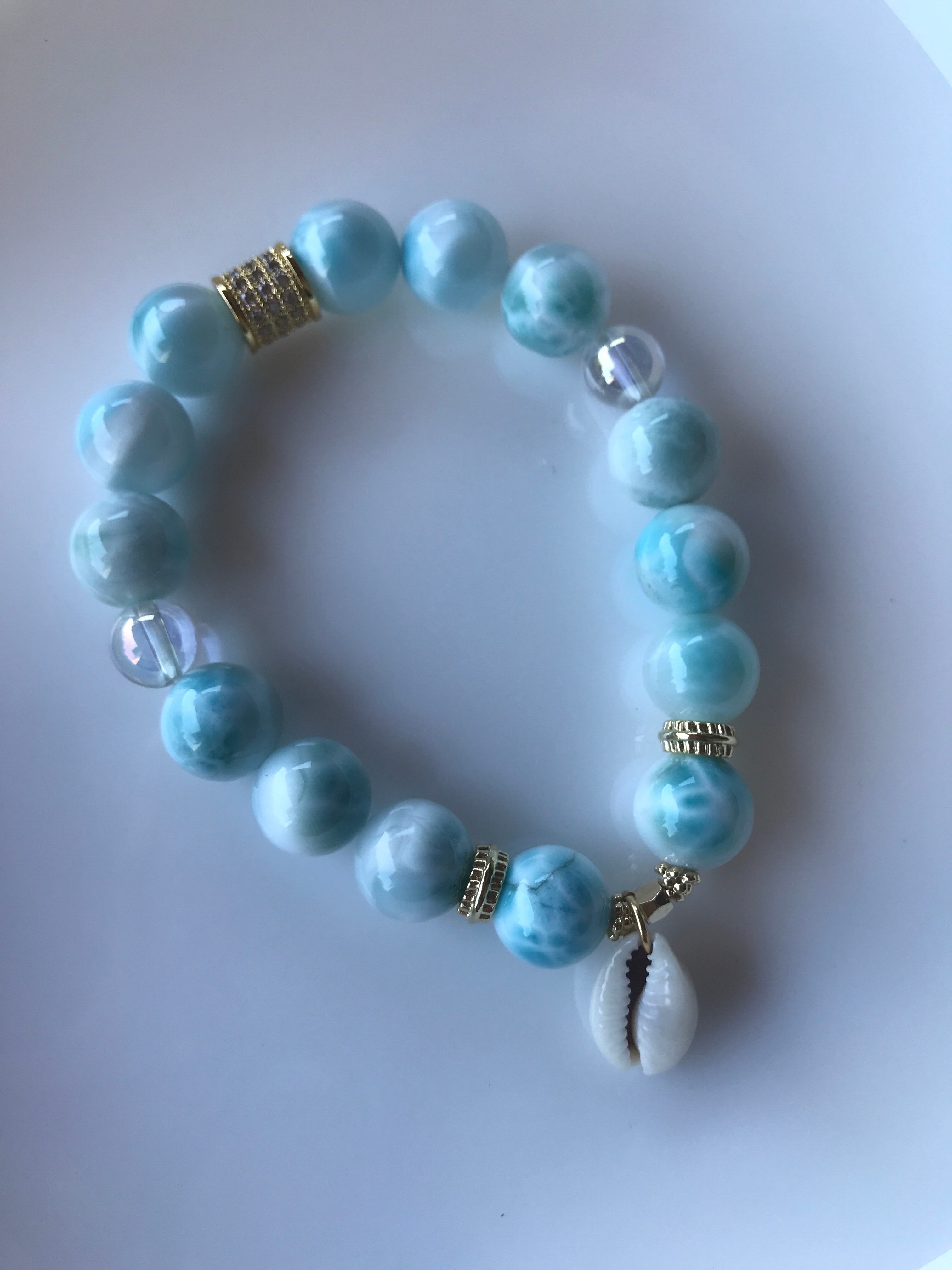 こちらは少しグリーンの入った波間模様も見えるプルプルのドミニカ共和国産のアイスラリマーにジルコニア仕様のゴールドロンデルをワンポイントにジュエリー感を出し、天然の貝殻をチャームに付けた夏らしい可愛いデザインブレスレットです。