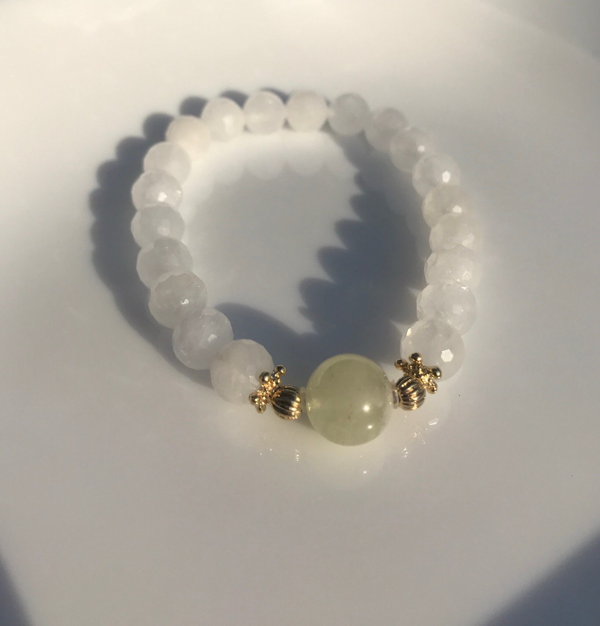 スノーマニカラン水晶ミラーボールカットとワンポイントリビアングラスのシンプルデザインブレスレットです。