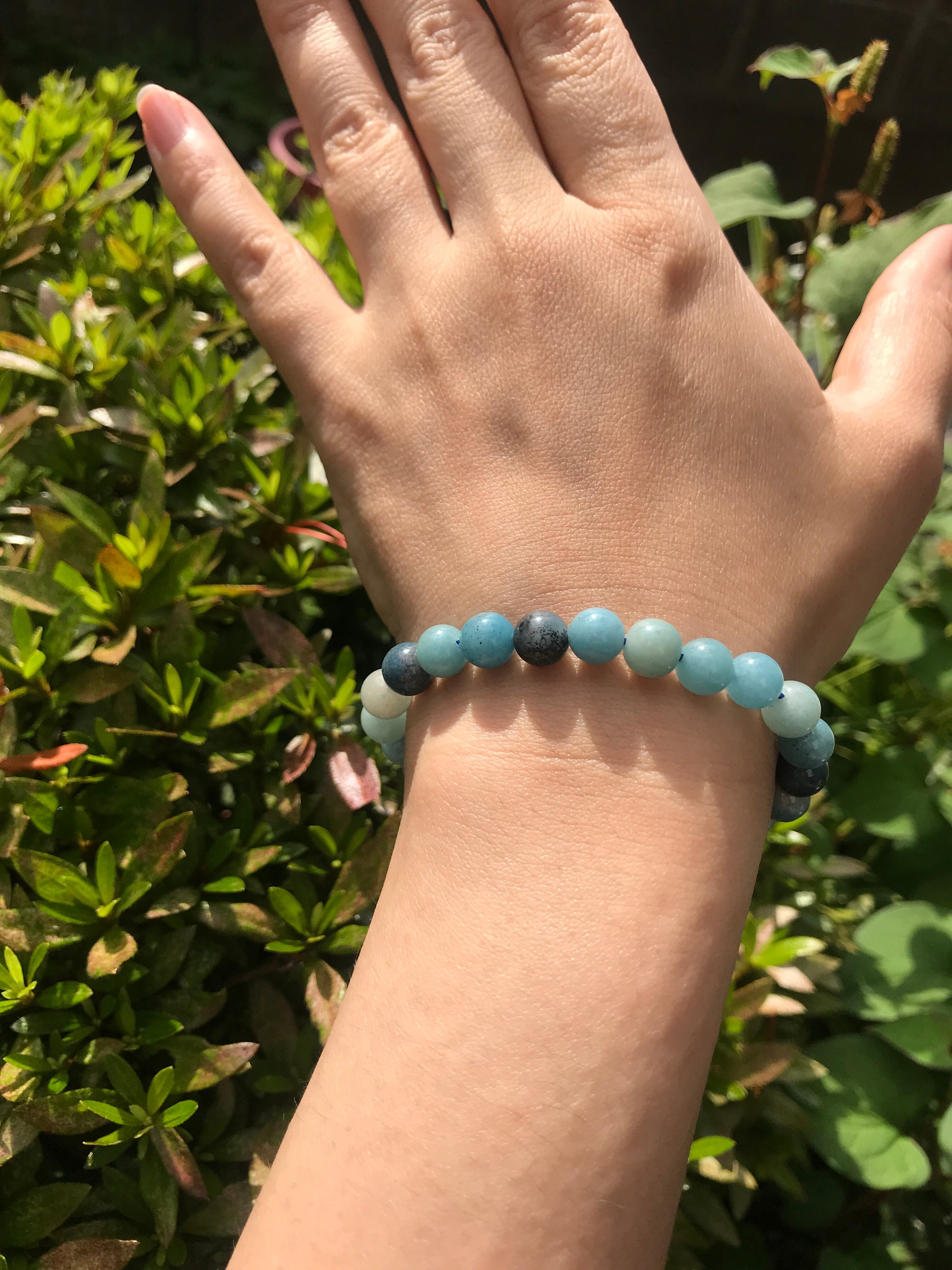 ラズライトの仲間で成分の比率からトロレアイト、スコルザライト、ラズライトになりますが、それらが混じり合って、水色、白、優しいブルーグレー、藍色の混ざったなんとも可愛らしい色味のブレスレットです。