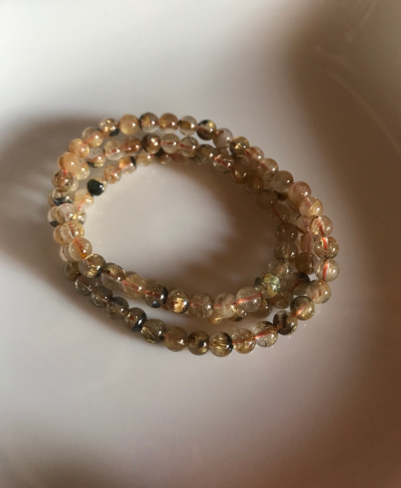 ルチルの根っことなるヘマタイト入りタイプでゴールドとブラックの色味が大人っぽいです。肌馴染みもよく着けやすいタイプです。
