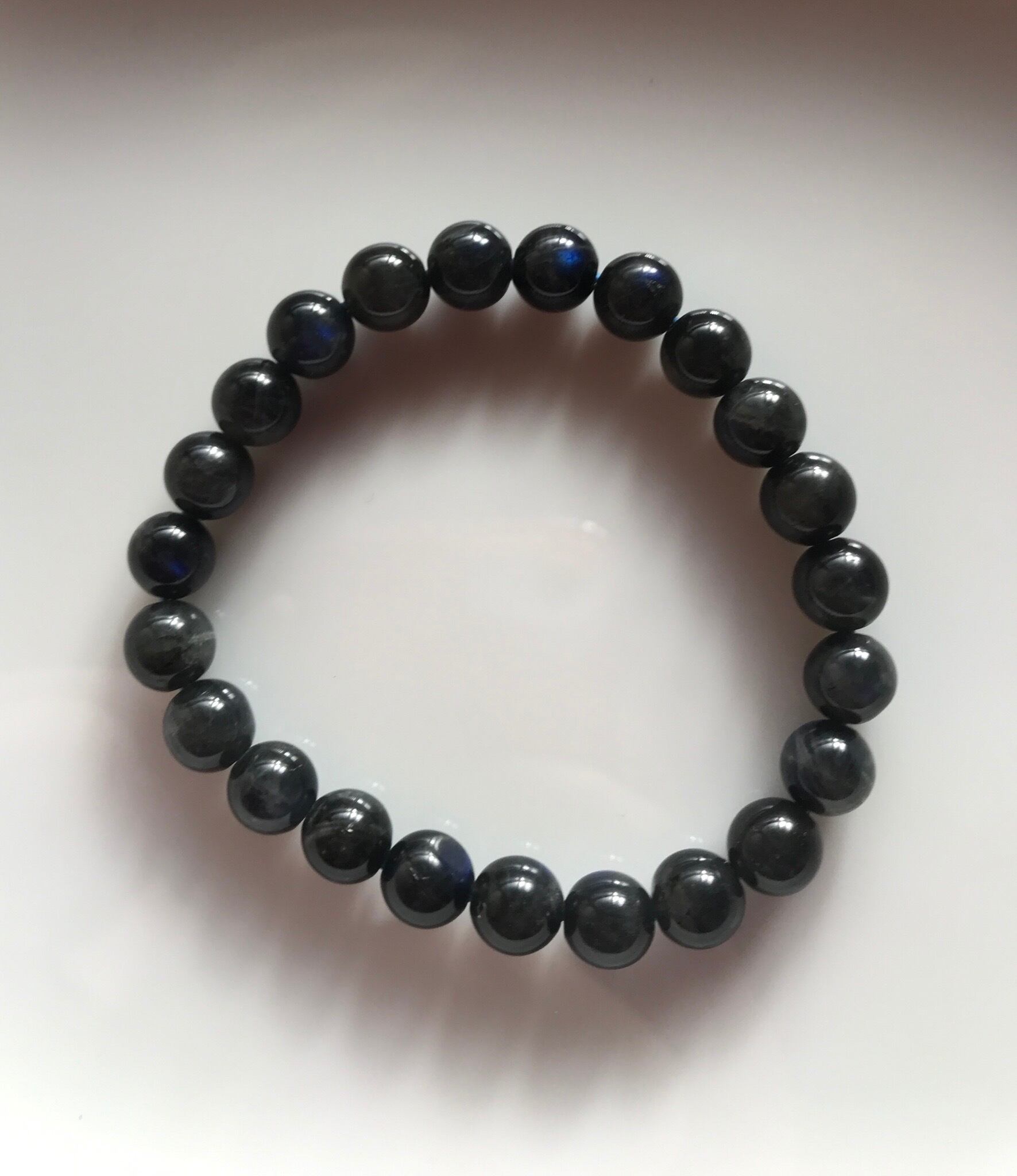 写真ではなかなか伝えられませんが、全珠にブルーのシラーとシルバーグレーのキャッツが浮かび上がる高品質キャッツアイブラックラブラドライトです。シックでクールなイメージです。