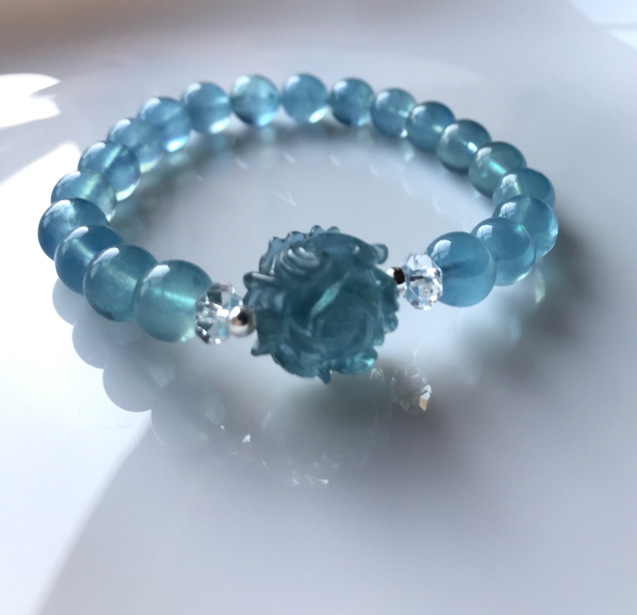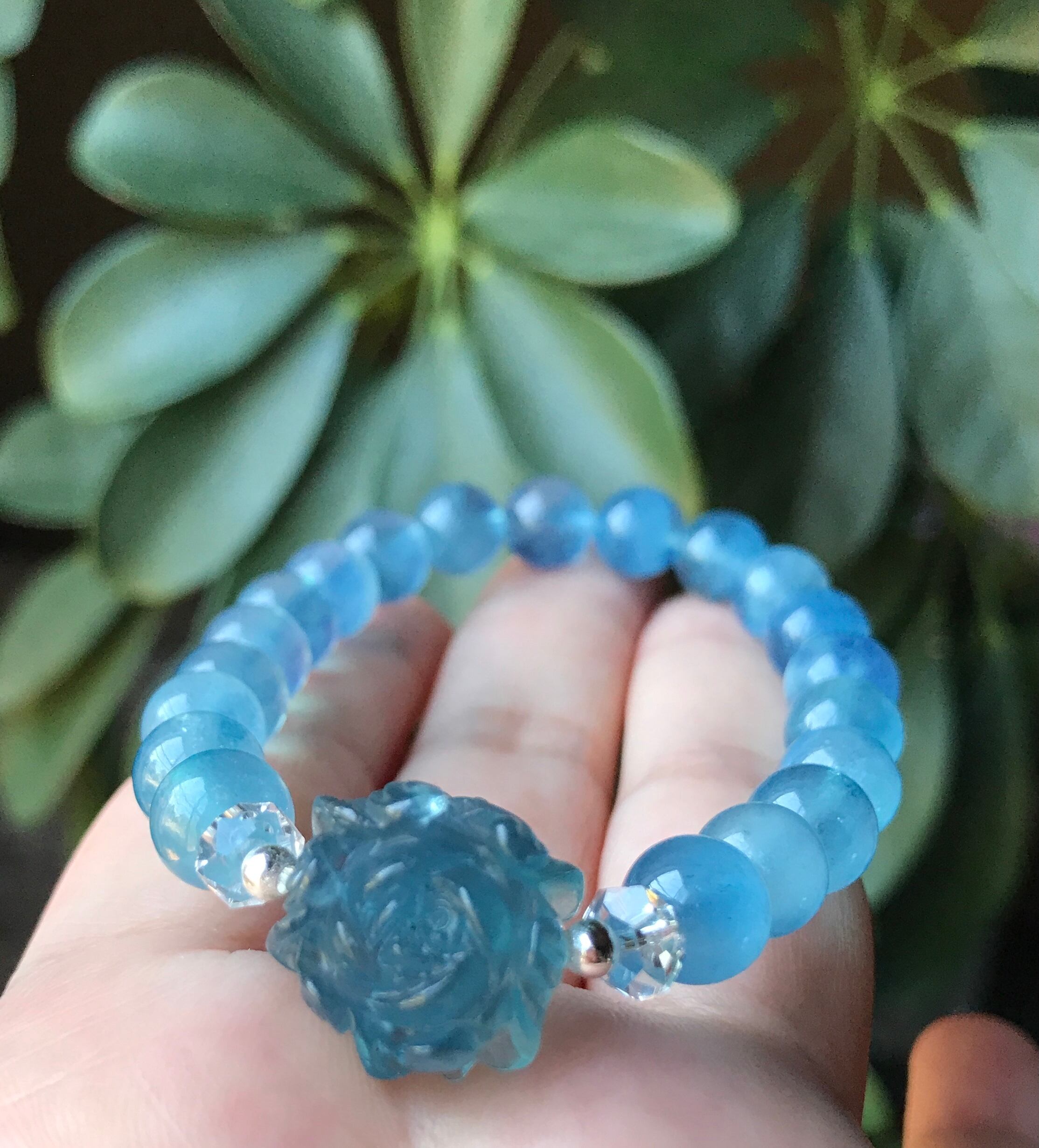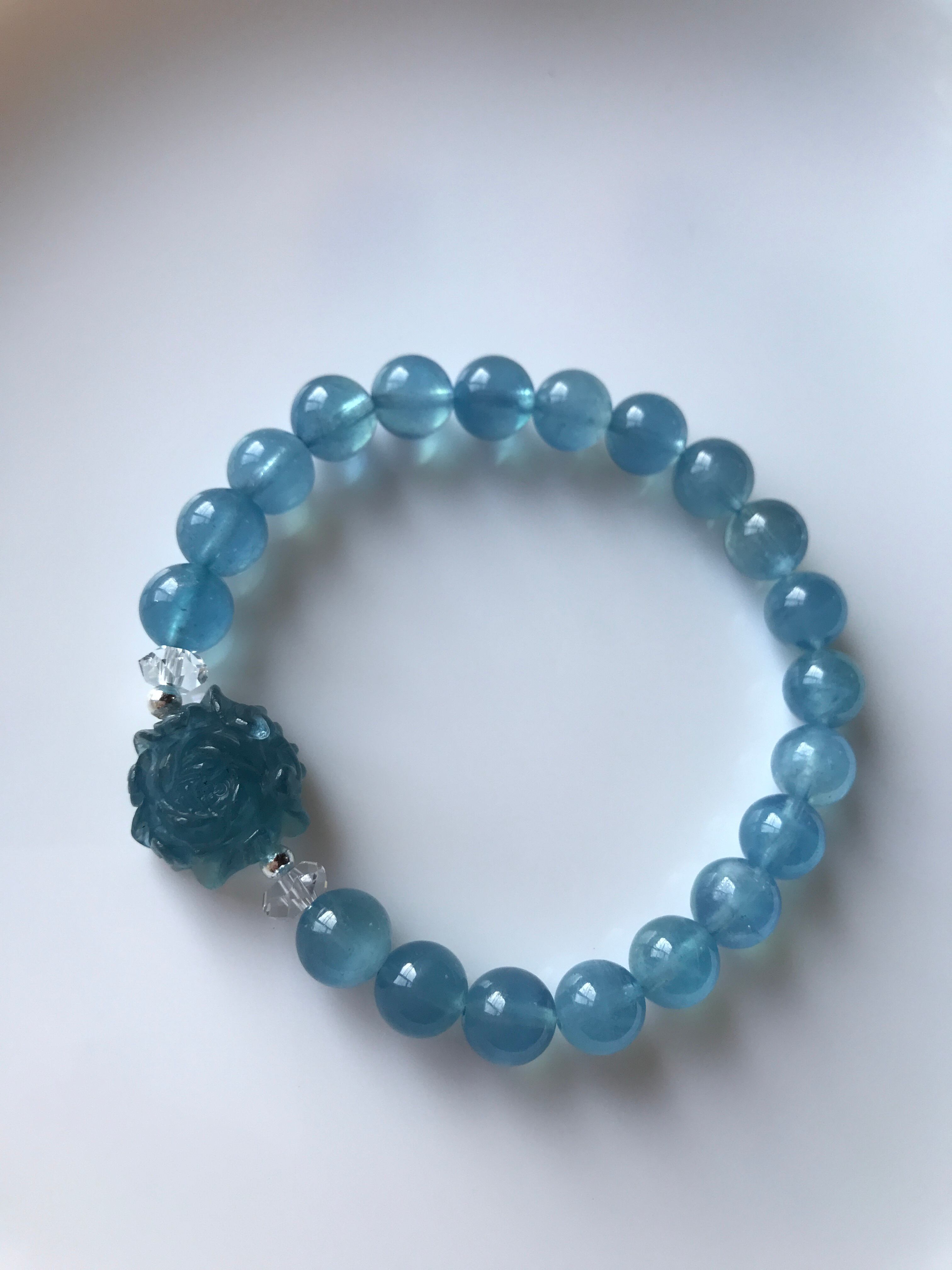 透明感のある深いディープブルーのアクアマリンの手彫りのお花パーツに色味を合わせたディープブルーアクアマリンオールで作ったブレスレットです。