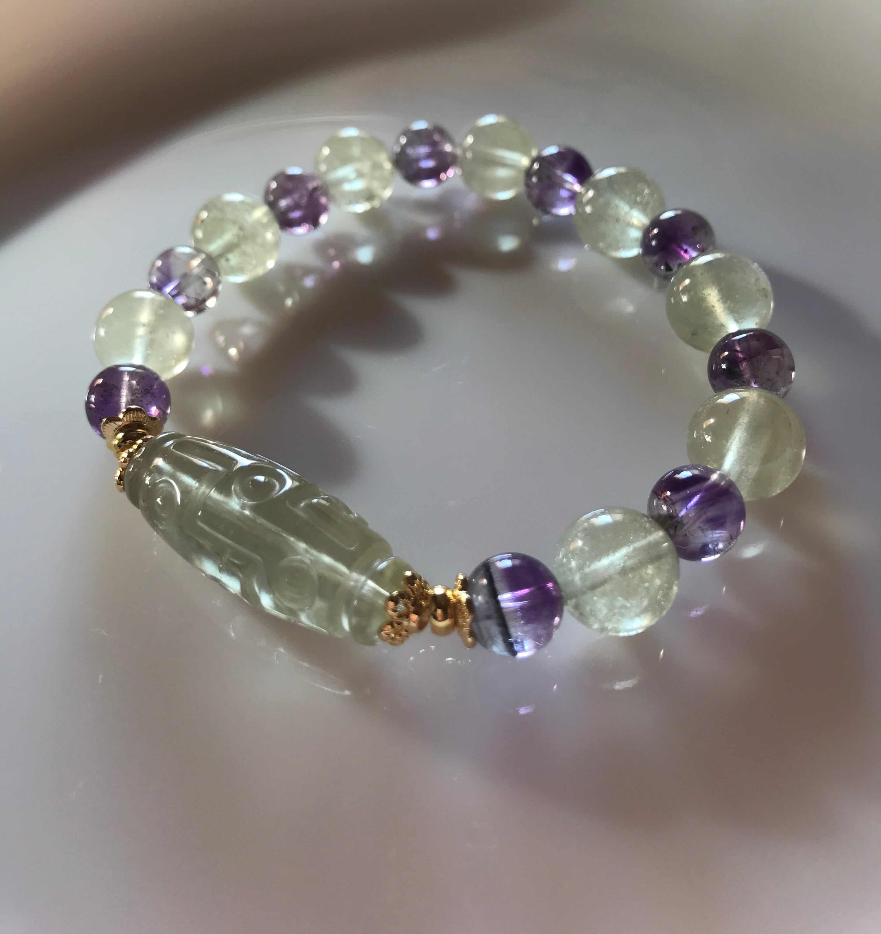 透明度の高い高品質リビアングラスの九眼天珠と高品質リビアングラス、アメジストスーパーセブンを使った大変パワフルなブレスレットです。