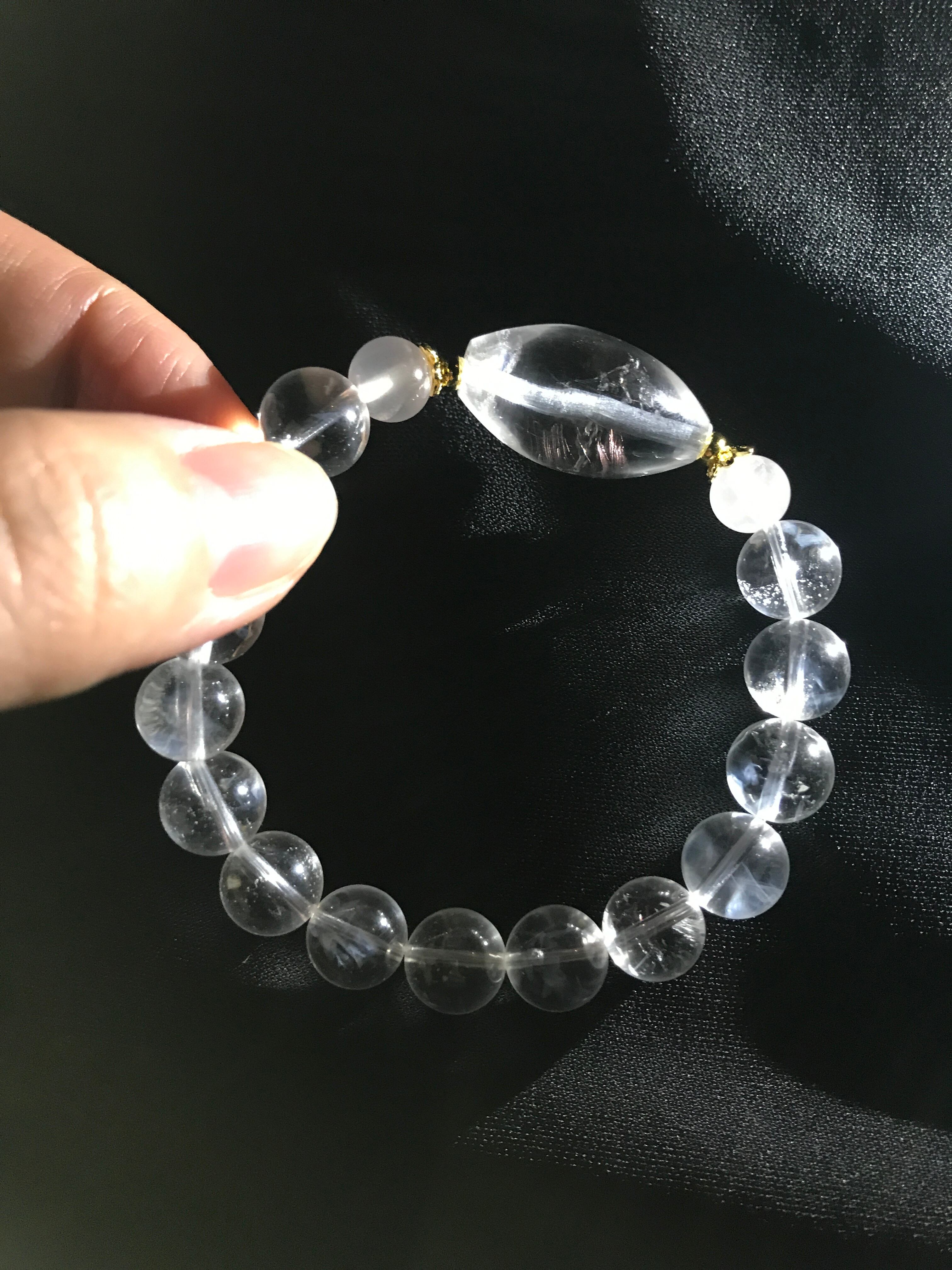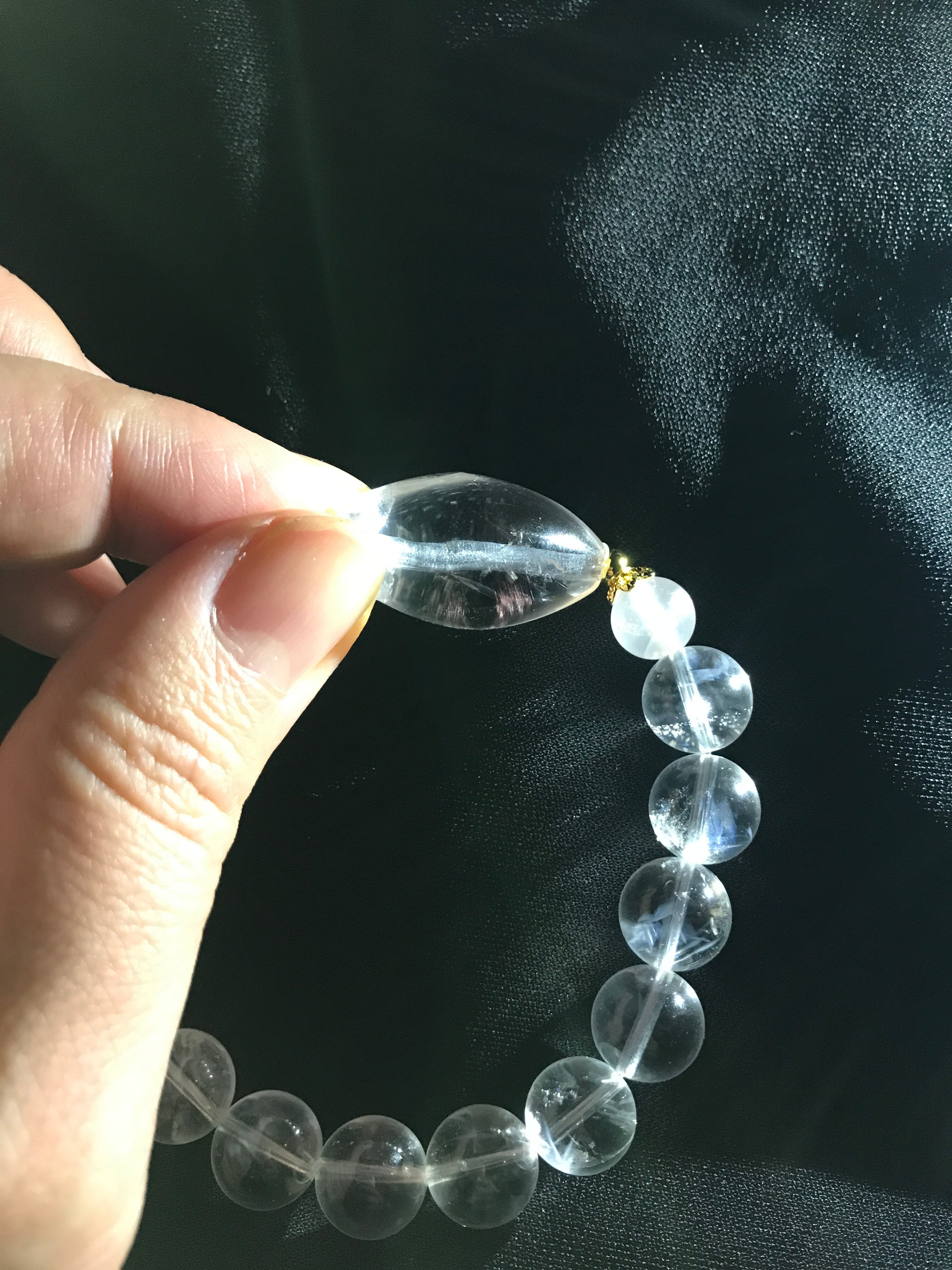 一見透明な水晶のブレスレットに見えますが、強い光に照らしてあらゆる角度から見ると幻想的なラダーの光が見えます。