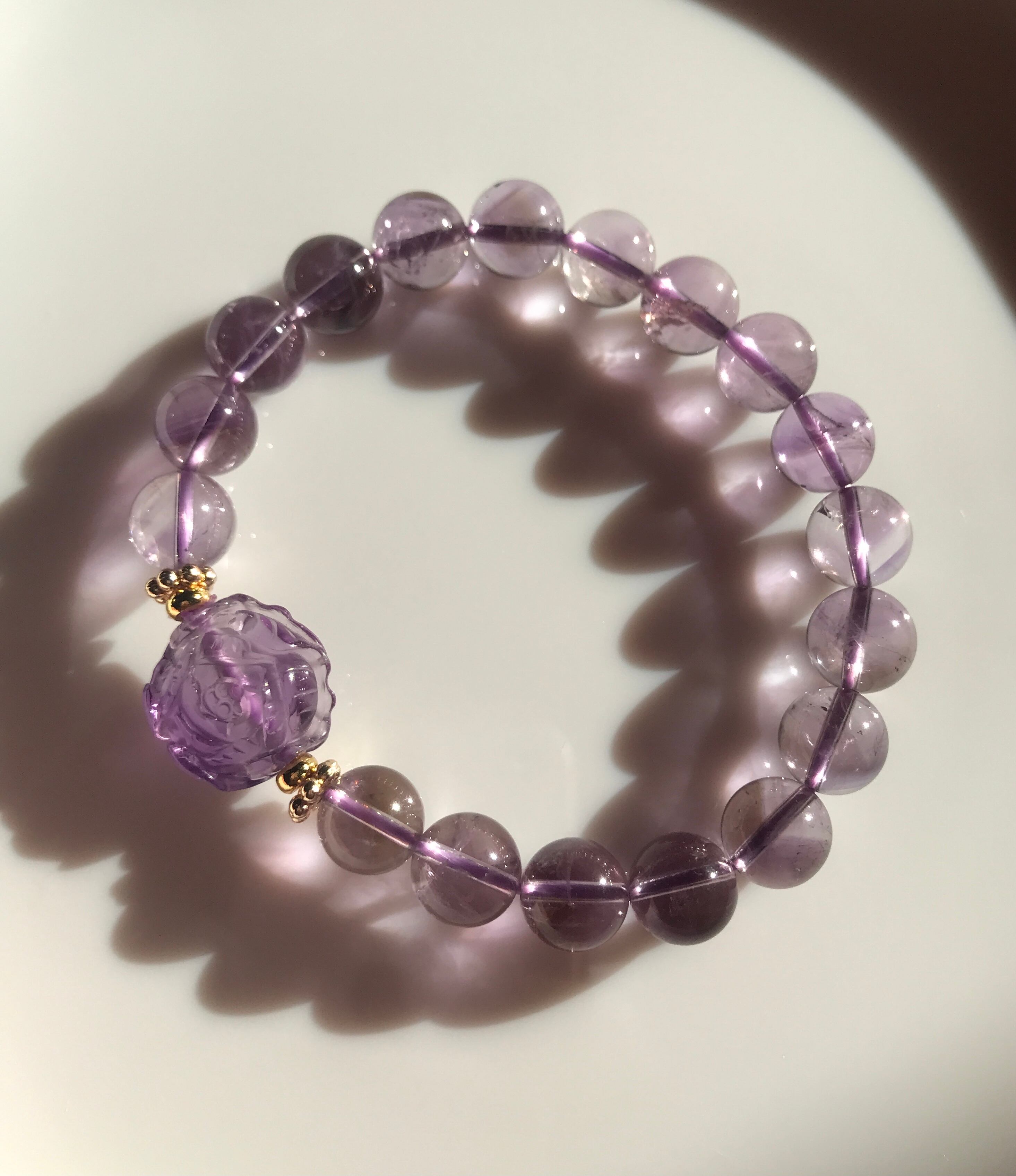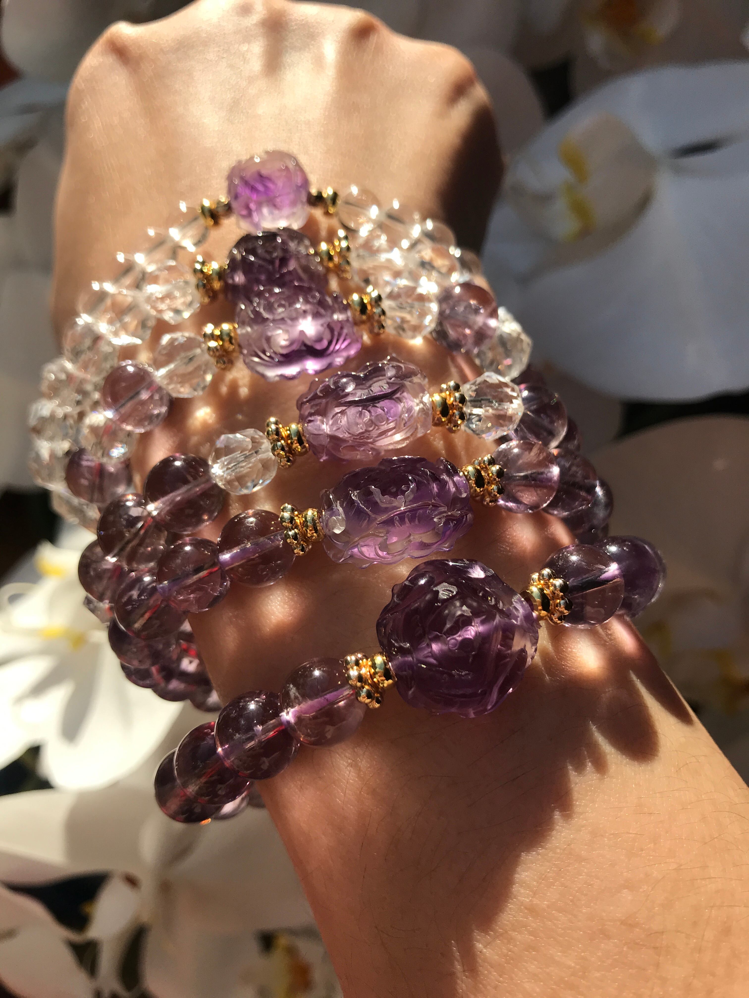 白と紫のバイカラーに見えるアメジストの手彫りのお花のデザインブレスレットシリーズ。