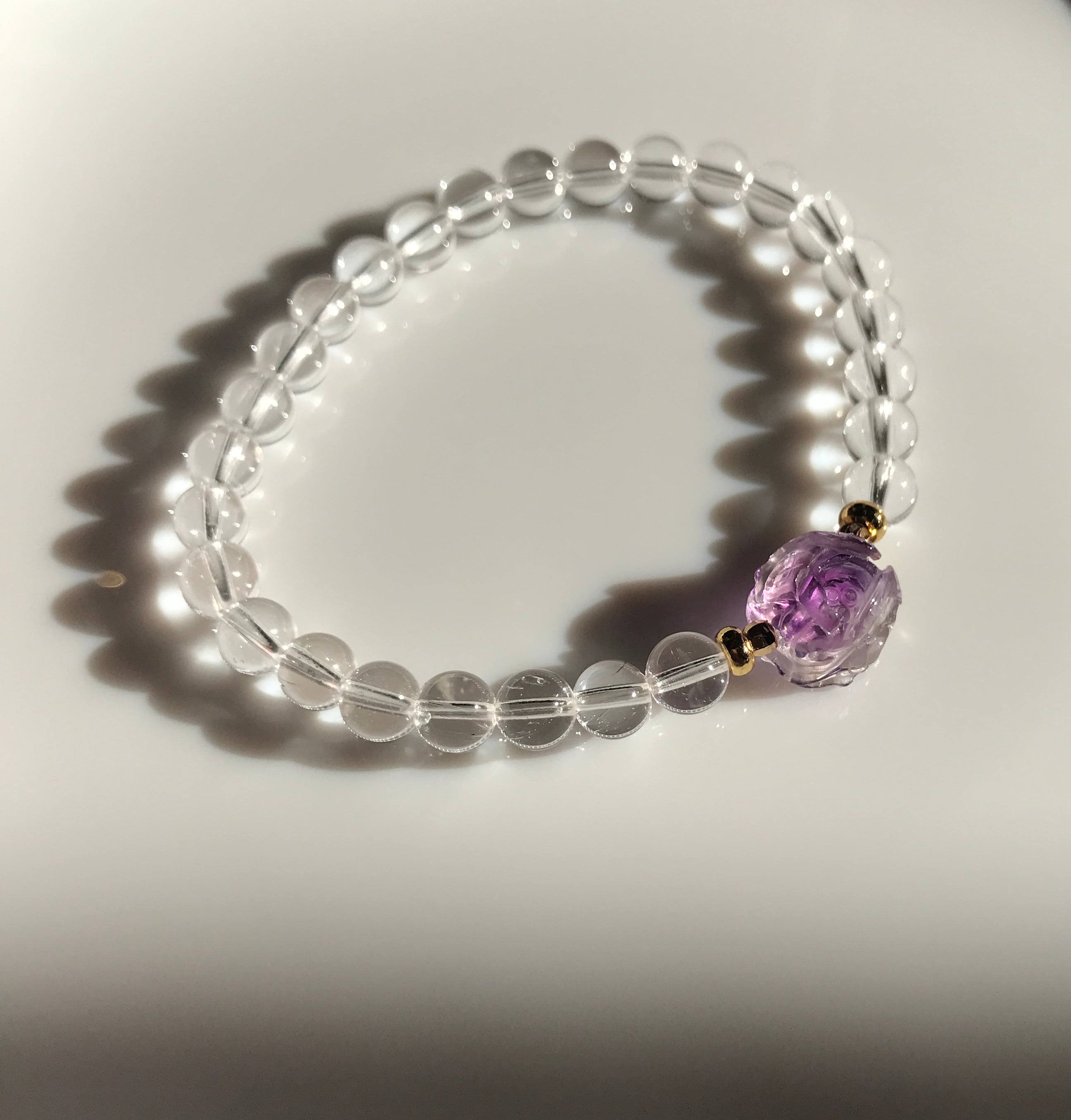 白と紫のバイカラーに見えるアメジストの手彫りのお花のデザインブレスレットシリーズ。