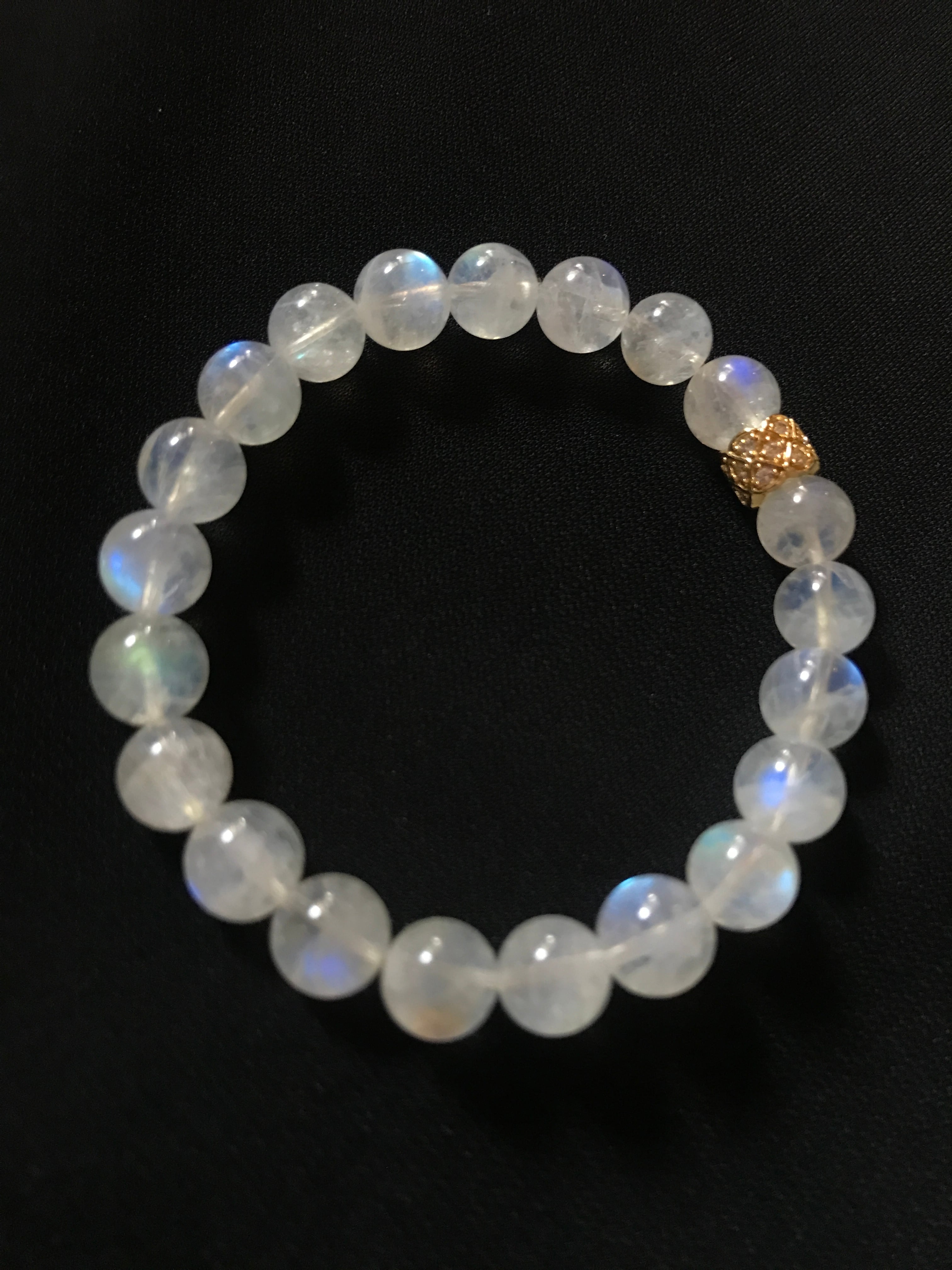 レインボームーンストーンブレスレット 内径16cm 使用天然石 レインボームーンストーン 約8.5mmx21 ゴールドジルコニアパーツ 8mmx1
