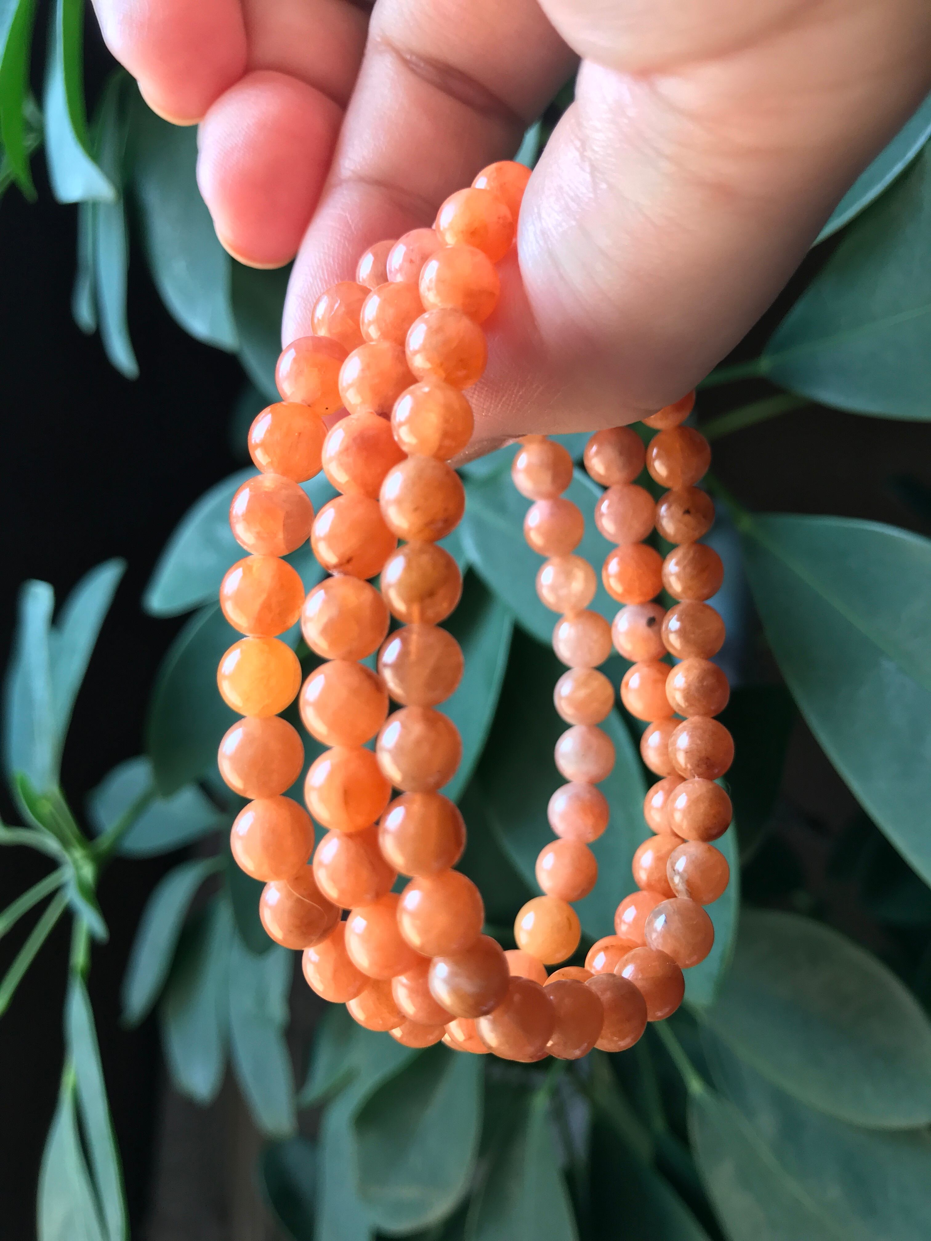 希少過ぎて市場でもなかなか見つけられない石で、更に白っぽく黒点がたくさん入ってしまう石ですが、黒点も少なめで綺麗なオレンジ色のブレスレットは大変気象で高価なものになります。